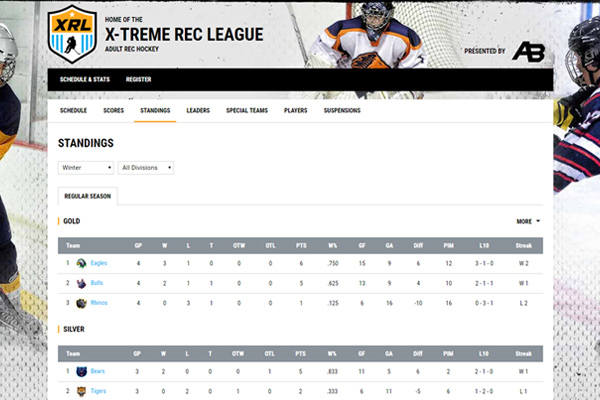 This demo is for recreational leagues who are already happy with their existing website provider. It just displays the stats information and has some basic customizable settings (logo, colors, background).