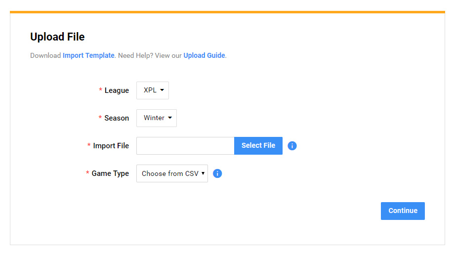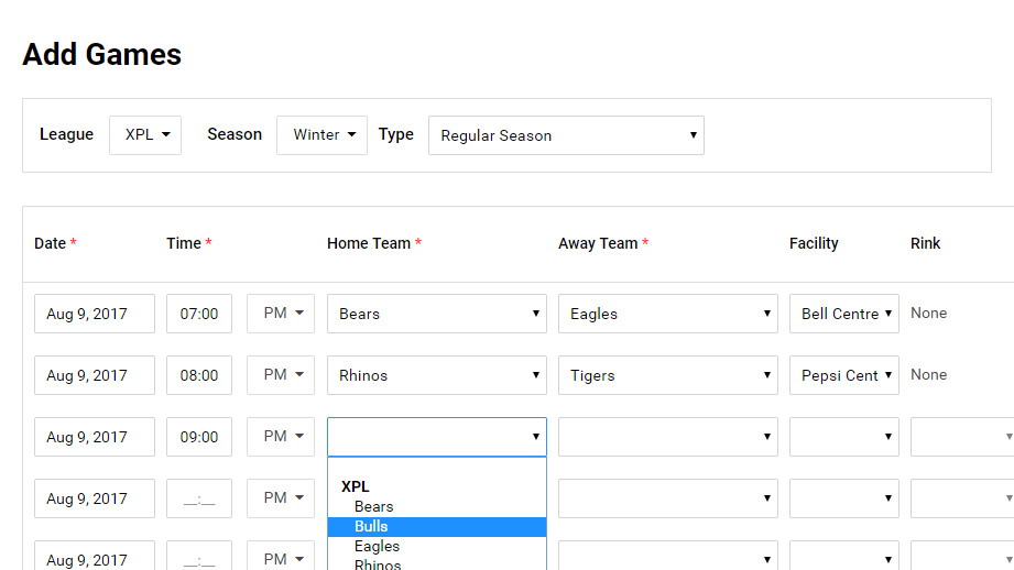 If you're looking to add many games at once you can create your schedule in your favorite spreadsheet program. Then upload your spreadsheet file and the system will schedule all your games.