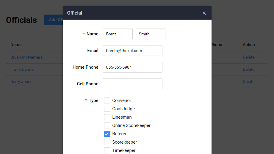You can manage a list of your referees and scorekeepers. Officials can be assigned to games. A report can be run to determine the number games an official has worked.