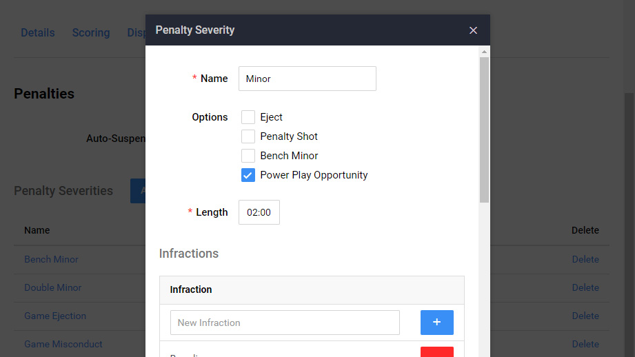 New leagues come with a default penalty list but you can add or remove penalties to match your league's rules.