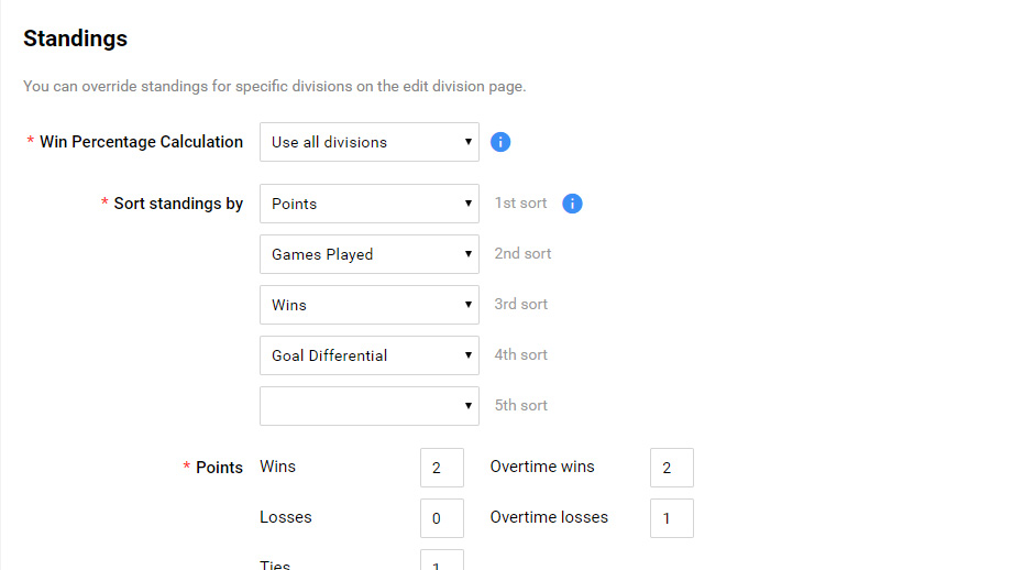 You can rank your team's standings by 12 different options. Points awarded for game outcomes can be changed for every outcome.