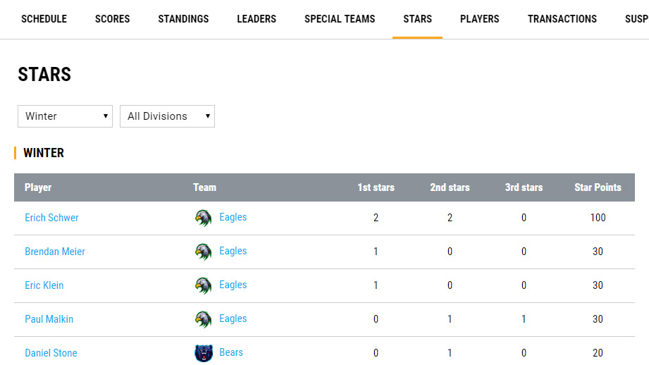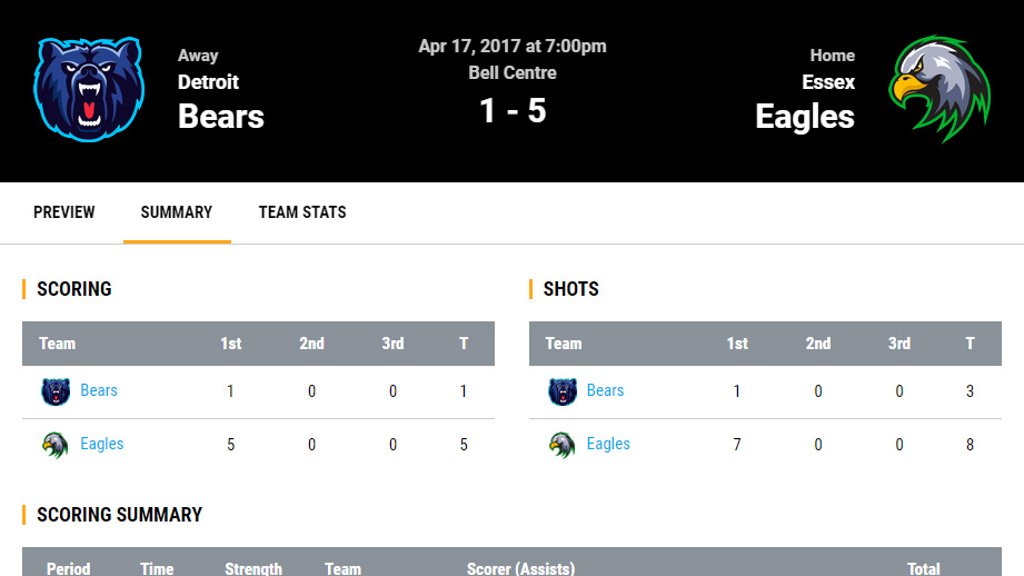 Follow the game with shooting, scoring and penalty summaries. Display the game's top three stars.